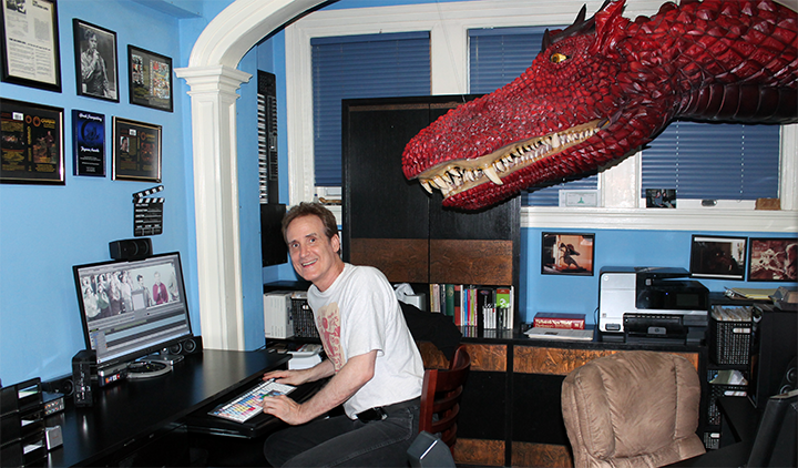 Brent Backhus had worked with Travis on the Grumpuss DVD, and was now working on the Feelin' Good digital transfers we'd from Deluxe, but in this photo, editor and DVD author Brent Backhus looks like he may require some reassurance. He normally doesn't mind a boss looking over his shoulder, but having a dragon, especially one as large as Long-Grin, and obviously a Travis Edward Pike fan breathing down his neck was another matter all together. Fortunately for allconcerned, Long-Grin had eaten earlier and was genuinely interested in the music videos..