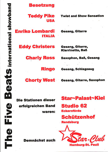 That afternoon, they named themselves "The Five Beats," leaving Teddy, as promised, the "guest star" from the U.S.A. They would have to rehearse without him during the week, but they'd all get together on the following weekend for their first big gig, back at Gasthaus Schröder, Behrensdorf.