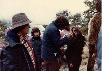 Top: Travis' youngest brother, Adam Pike, with Dina Backlinie, pose in their costumes for the first time. Below: While Adam and Shawn McEnroe look on, Steve Johnson applies makeup to prevent Dina's human face from showing under her mask.