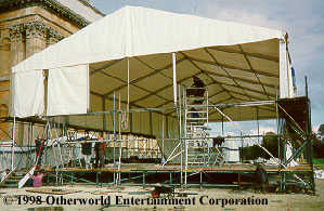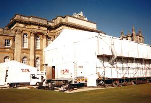 Director of Photography Peter Anderson worked with Maidstone Marquee as they erected the theatre on the south side of the palace. Width and length posed no problem, and by raising and extending the platform over the palace stairs, a crawl space was created for heating ducts and wiring. But this was the highest marquee Maidstone had ever erected, and once up, it still had to be carpeted, wired, draped and lined before the lighting grid and stadium seating could be installed. |
