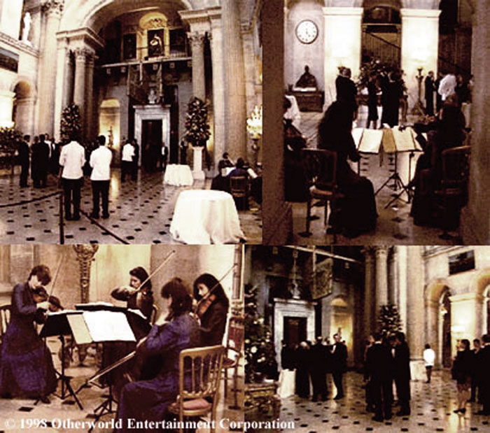 This collage, from the Reception in the Great Hall prior to the World Premiere is made up of shots extracted from footage captured with a hand held digital video camera. My guests were greeted with Champagne, canapés, tours of the palace, and chamber music performed by the Angelique String Quartet, seen best in the photo at the lower left corner. I was pleased to discover we had some photos of these ladies, who played during the reception, intermission and banquet, too. I finally did hear them play at the banquet and can attest to their superb musicianship, but sadly, before I could meet them, like so many Cinderellas, they all disappeared! |