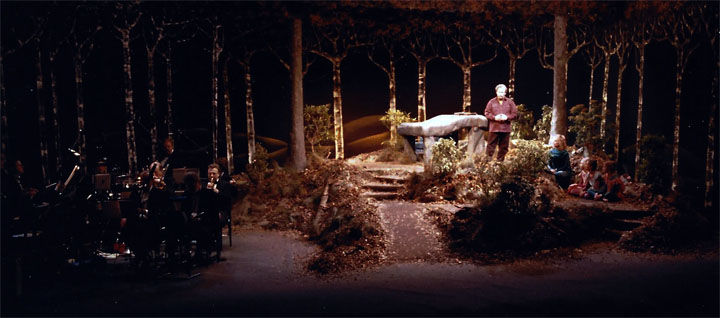 Maidstone Marquee was still erecting the theatre when the electricians began installing the lighting grid. The next day, the set construction crew began building the set. Production designer Shaun Moore wrote, Beyond the ramps, steps and staging to support the forest floor, the set was built entirely on location with parts assembled from hire companies and leaves and woodland dressings raked up and gathered on the grounds of Blenheim Palace. Shaun was injured in a car wreck on his way to the scenic artist's studio in Elstree, where the backdrops were being painted. Art director, Rebecca Brett-Schneider, along with the crew from the set construction company, Scene-It-All, carried on with Shaun directing operations from a hard backed chair. The path (center) from the cromlech to the floor of the marquee is part of my fairy tale set, but the space next to the orchestra was created to allow a roving camera to move in to get a not-quite-reverse angle on the action. |
