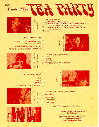 From the beginning, "Travis Pike's Tea Party" was a concert oriented group, built around a solid repertoire that eventually included some 200 of Travis' original songs. They did best in concert venues and on college campuses, where they could showcase their talent and material. Although the "Tea Party" never claimed to be a dance band, their driving rhythms and wailing guitars were more than enough to keep their fans rockin,' and when they performed The Red-backed, Scaly, Black-bellied, Tusked, Bat-winged Dragon, they even brought back the Charleston.