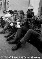 These blow ups off a proof sheet of photos taken in 1968 outside the old Pike Productions Studios at 47 Galen Street in Watertown, are the only pictures Travis has of the original Tea Party.  From left to right, Karl, Phil (his face hidden by the tea pot), Mikey Joe, Travis and George.