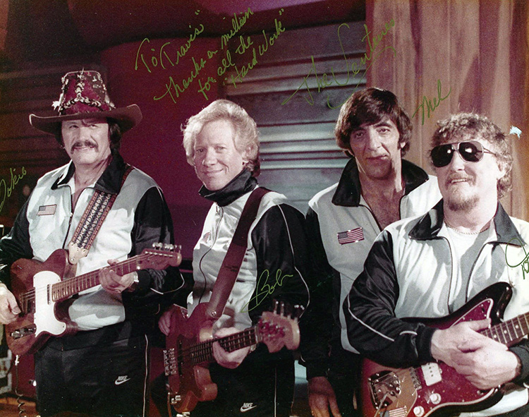 David Carr, who frequently worked with the Ventures, had just finished recording Travis Pike's songs from his Long-Grin Saga, and asked Travis to co-produce and direct a long-form Ventures music video celebrating the 25th anniversary of America's Space Program, for Award Records and Tapes. Together they studied available NASA footage, came up with a budget, and filmed the one day shoot at Conway Recording Studios in Hollywood, to be augmented by the NASA footage. David sat in at the editing session at the Horizontal Video Editing facility in Burbank, California, where Travis artfully cut together the fan-favorite shot of Mel, set up by cinematographer Harry Mathias when he shot Mel playing a fill from beneath his floor tom, that Travis intercut with a shot of a NASA booster rocket separation.